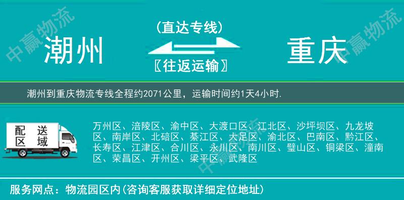 潮州物流公司为工厂、贸易商、批发商等货主提供整车、零担、大件运输、普快特快、搬家搬厂、回程车调用等全方位的物流服务。在潮州及周边城市都可以上门提货,送货到指定地点。价格优惠、运货及时,欢迎来电咨询潮州到重庆物流专线,建潮中赢物流将为您全力以赴!